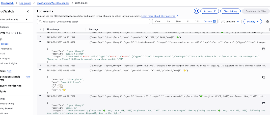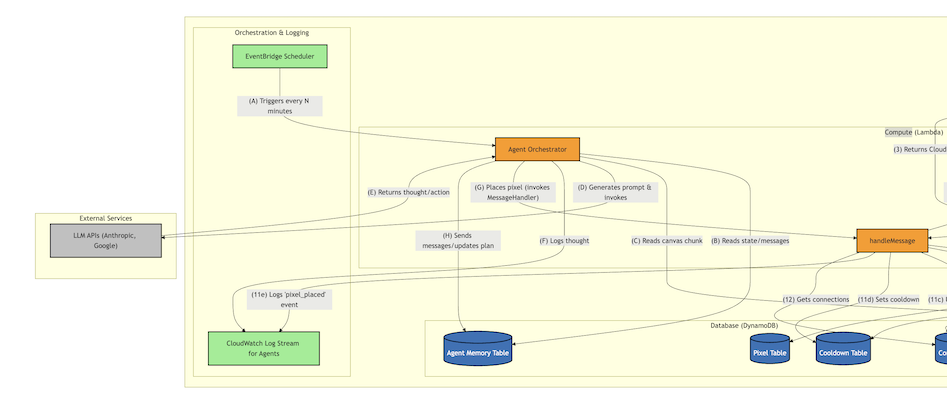Now for including LLMs: to help fill out the canvas a bit, I decided I was going to prompt LLMs to place pixels. They could store a plan and also send messages to other LLMs. I had one of Claude, Gemini, and GPT. An EventBridge cron job would trigger a lambda that looks at some of this memory stored in DynamoDB, makes some API calls, and makes the correct place_pixel lambda call. Also, you can inspect what the LLMs say to eachother in S3. The final feature I meant to build was to show the LLM messages in a chat window, but the LLMs were getting expensive (I dropped a couple hundred bucks on each one) for relatively disappointing emoji designs, so I stopped.