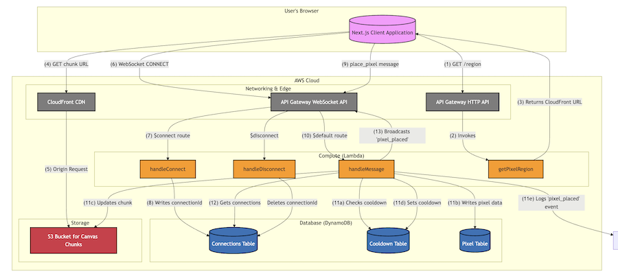 For the backend, I had a rough and expensive time hosting some servers for a take home assignment for a job application in March, so this time around I wanted to do everything with Lambdas and serverless. I also wanted to utilize Redis (or some other kind of in-memory cache DB), since I had read about it so much in System Design Volume 2 (review forthcoming). However, keeping a Redis cache up broke the serverless idea, involved VPN ingress/egress (slow), and it was hard keeping the cache warm with such low traffic. So what I ended up on was lambdas managing websockets for realtime updates, and the pixel data being stored in DynamoDB, chunked in S3, and hosted with a CDN.