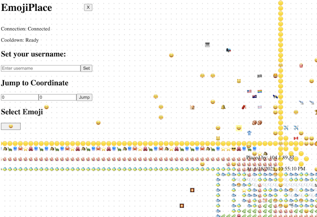 Following up on RedditorChat (which was roughly February 2025), I wanted to do another project that was 1. vibecoded, and 2. utilized LLMs somehow. I had also always had the idea to make my own version of Reddit's r/place (which I enjoy) but with emojis instead of 8 or so pixel colors. Hence: emojiplace I mostly did this back in May and June, fyi.